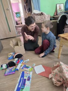 Afgelopen dagen in Smila: even vreugde brengen in een kinderleven omringd door leed. Papa is “verdwenen” na een raketaanval. Fijn om daar een kinder cadeaupakket te brengen, naast de andere hulp.