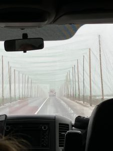 Na een paar dagen van dooi is er nu grauwe lucht, en het gaat sneeuwen. Net als 10 december 2025, als een bescherming op deze gevaarlijke route Charkov-Izium-Slovjansk. Totaal 195 km rijden. We passeren het in 2022 zo gehavende Izium, en vandaar tot bij Slovjansk is nu een traject van 50 km (!) overdekt met anti-drone netten.