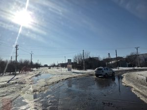 Deze strenge winter hebben de toch al matige wegen enorm geleden. Soms is over honderden meters alles kapotgevroren en één grote gatenkaas. Uitdaging voor voertuig en (de rug van) inzittenden.
