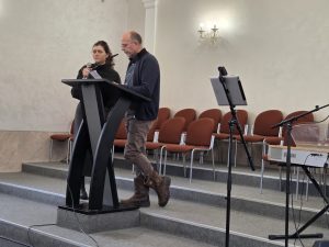 In Slovjansk desondanks een fijne dienst, de geluiden van oorlog buiten, Gods Woord, gebed en zang/muziek binnen.