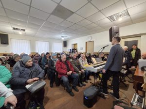 In de middag in Kramatorsk, in het kleine huiskerkje van 8×6 meter kwamen 90/100 mensen luisteren. Vervolgens op weg naar “huis” nog gestopt in Izium om de schade aan de evangelisatietent op te nemen. Van een helft heeft de constructie het begeven door zware sneeuwval. We bespreken hoe we dit willen repareren. In de avond zijn we terug in Merefa na een lange, intensieve dag. De Heere bewaarde ons, en gaf nog gelegenheid tot verkondiging van het evangelie in Woord en muziek en uitdeling van hulp. Zijn Naam zij geprezen.