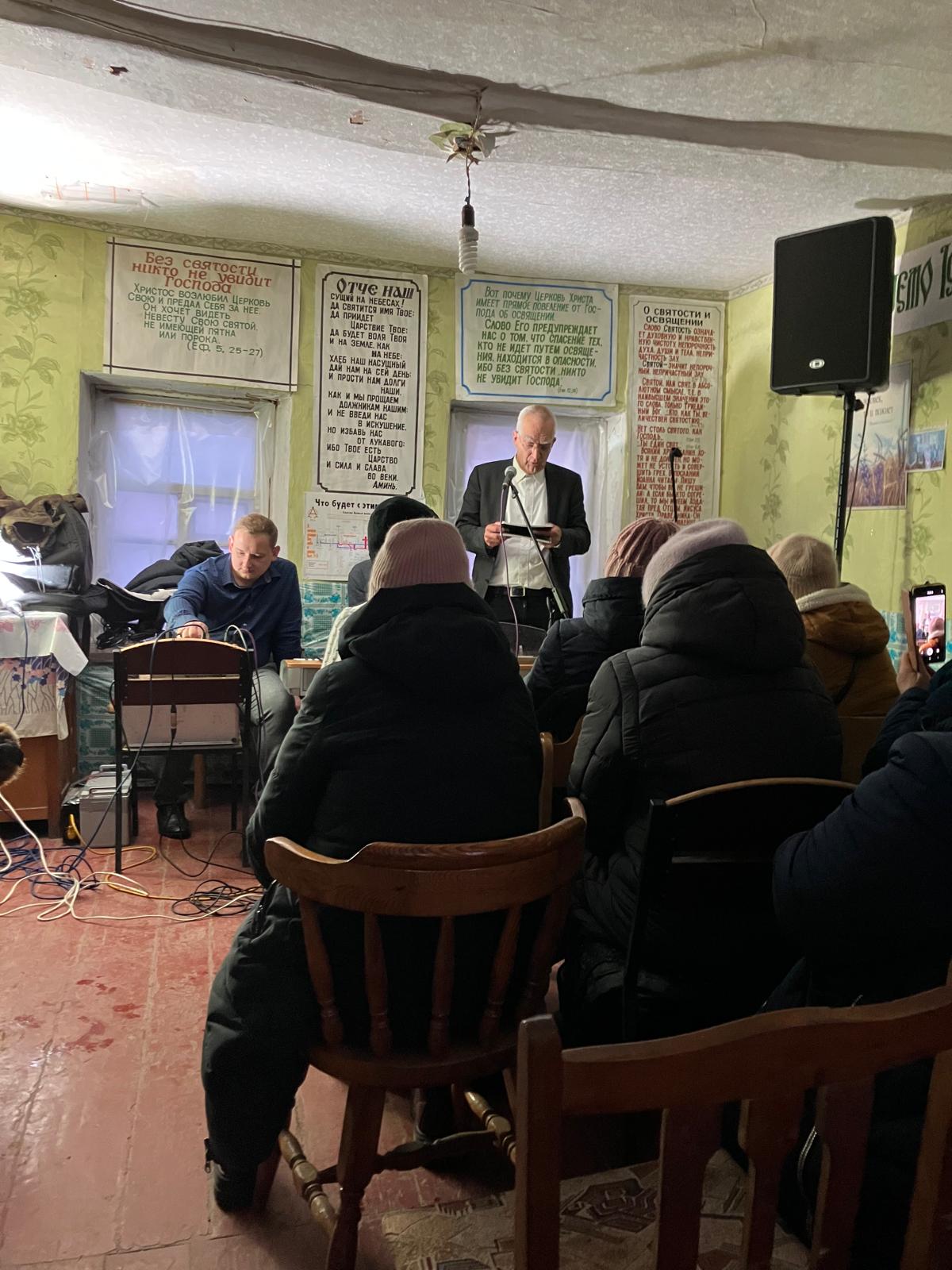 Zondag 10.00 uur dienst in Merefa, voor 275 ongelovigen. Sprak over Math 1: 21. De Naam Jezus, Zaligmaker van Zijn volk, van hun zonden. Broeder Andrei sprak uit Math 11:27. Daarna in sneeuw met wolken dek naar het kleine dorp Velika Pasarivka, kleine gemeente 4 km van Russische grens. De lange rechte weg 25 km, stil en eenzaam, tussen linies en mijnenvelden door. De Heere gaf een dik sneeuwwolkendek deze middag. Gisteren werden bij blauwe lucht nog twee autos bestookt door drones. Ach, wat ervaren we de noodzaak beschut te worden.